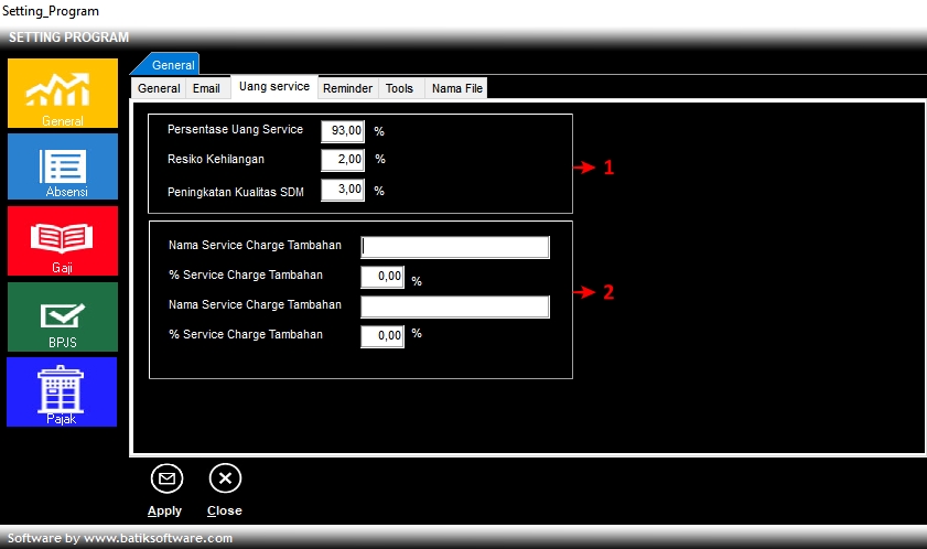Tab ini berisi kolom untuk mengisi presentase perhitungan uang service yang akan diberikan kepada karyawan.