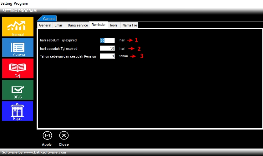 | 3 | Tahun sebelum dan sesudah pensiun | Diisi berapa tahun sebelum/sesudah hari H reminder pensiun akan ditampilkan |