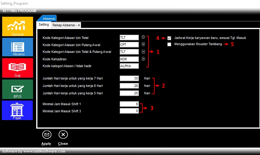 | 2 | Jumlah Hari Kerja 7/ 6/ 5 Hari | Diisi jumlah hari kerja dalam 1 periode masing-masing |