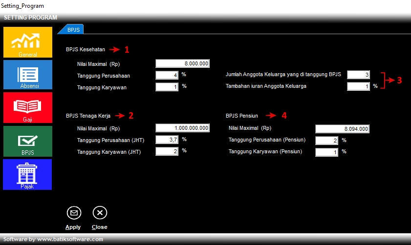 | 3 | BPJS Tambahan | Jumlah Anggota Keluarga yang di Tanggung BPJS, Diisi jumlah maximal anggota keluarga yang jaminan kesehatannya ditanggung BPJS Tambahan Iuran Anggota Keluarga, Diisi presentase iuran perorang jika karyawan mengikutsertakan keluarganya ke BPJS namun jumlahnya melewati batas maximum yang ditanggung BPJS. |