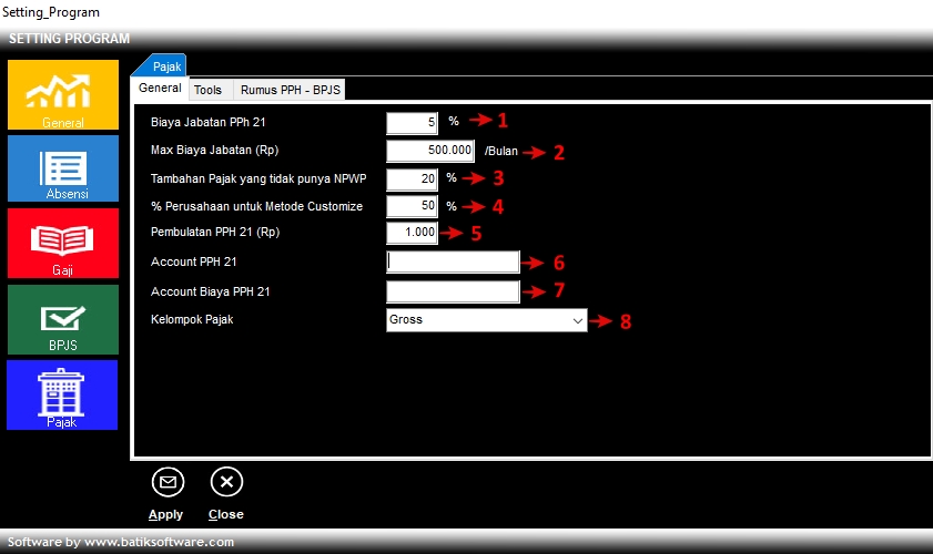 | 7 | Account Biaya PPh 21 | Diisi kode perkiraan untuk menampung nilai biaya PPh 21 untuk Export Jurnal |
