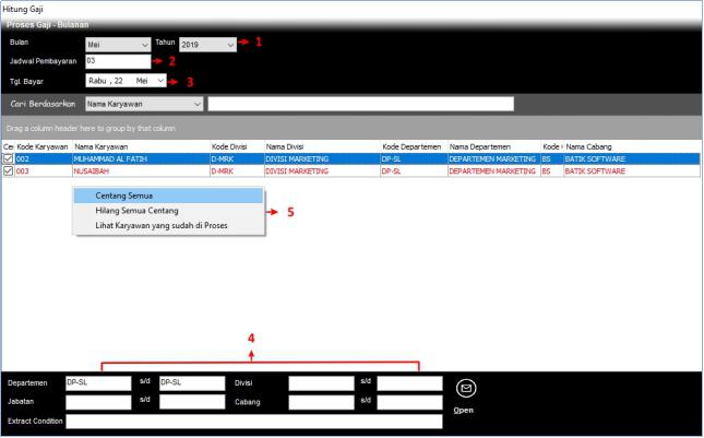| 5 | Centang Semua/Hilang Semua Centang/ Lihat Karyawan yang sudah di Proses | Klik kanan tampilan, Centang Semua, untuk memilih semua karyawan yang tampil pada form tersebut. Hilang Semua Centang, untuk menghilangkan semua centang. Lihat Karyawan yang sudah di Proses, untuk menampilkan data karyawan yang gajinya sudah diproses pada periode tersebut. |