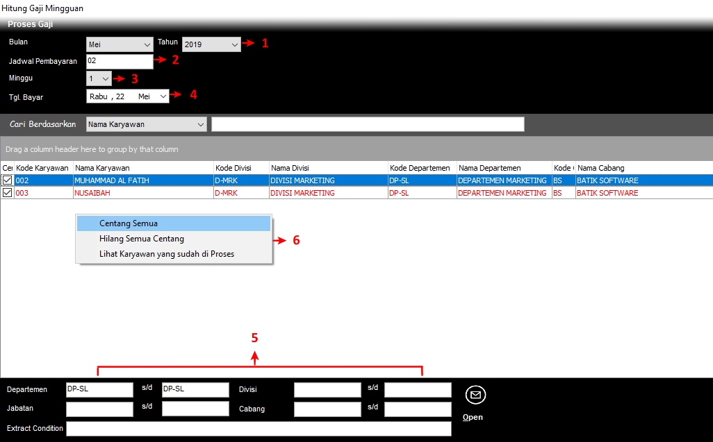 | 6 | Centang Semua/Hilang Semua Centang/ Lihat Karyawan yang sudah di Proses | Klik kanan tampilan, Centang Semua, untuk memilih semua karyawan yang tampil pada form tersebut. Hilang Semua Centang, untuk menghilangkan semua centang. Lihat Karyawan yang sudah di Proses, untuk menampilkan data karyawan yang gajinya sudah diproses pada periode tersebut. |