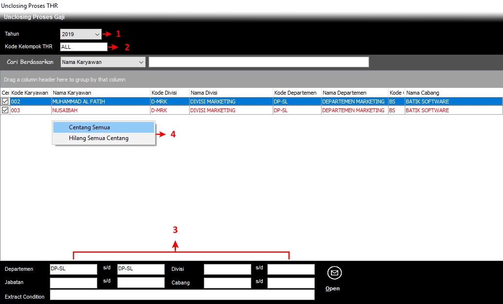 | 3 | Departemen/ Jabatan/ Divisi/ Cabang/ Extract Condition | Klik 2x untuk mengambil kode Departemen/ Jabatan/ Divisi/ Cabang/ Extract Condition untuk memfilter kode karyawan yang akan ditampilkan kemudian klik Open |
