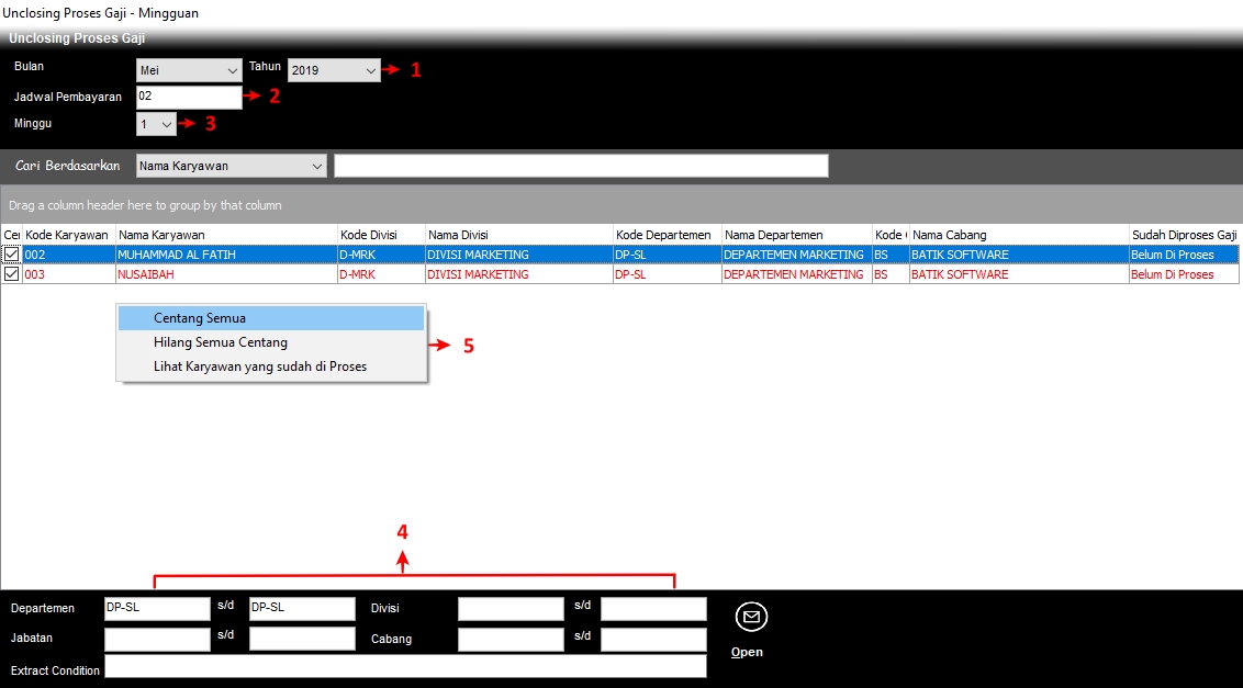 | 4 | Departemen/ Divisi/ Jabatan /Cabang | Klik 2x kolom untuk filter tampilan karyawan berdasarkan Departemen/Jabatan/Divisi/Cabang/Extract Condition, kemudian klik tombol Open |
