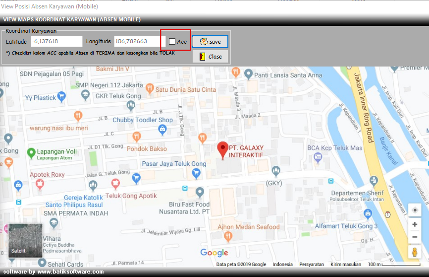 4. Pada tampilan diatas terdapat checkbox Acc, checklist pada checkbox tersebut untuk melakukan Acc kemudian klik Save. Apabila absensi mobile akan ditolak, cukup klik Save saja tanpa checklist Acc.