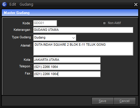 ** Apabila data gudang sudah tidak digunakan, jangan dihapus namun di nonaktifkan.
