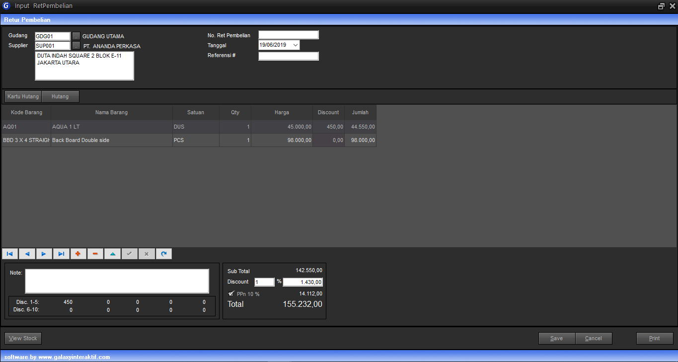 | Total | Muncul total retur barang yakni dari subtotal-discount+PPN10% |