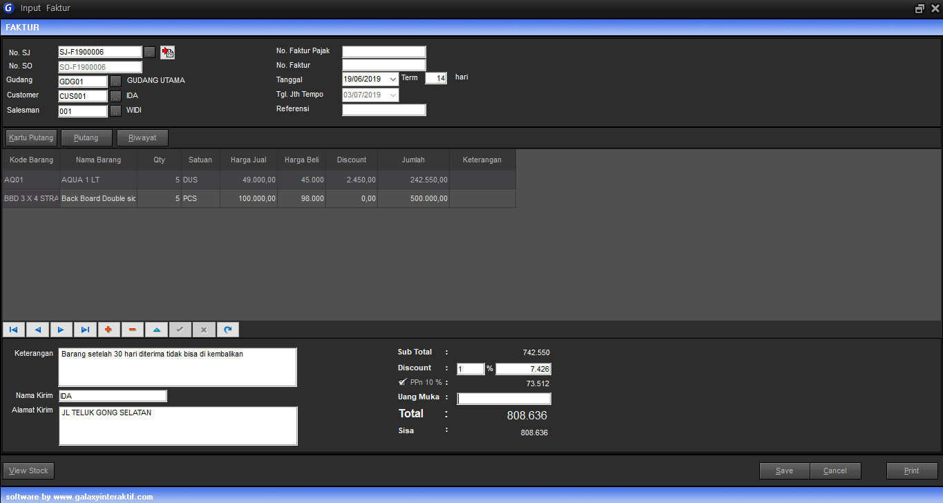 | Discount | Muncul otomatis diskon barang apabila No. SJ sudah diisi |