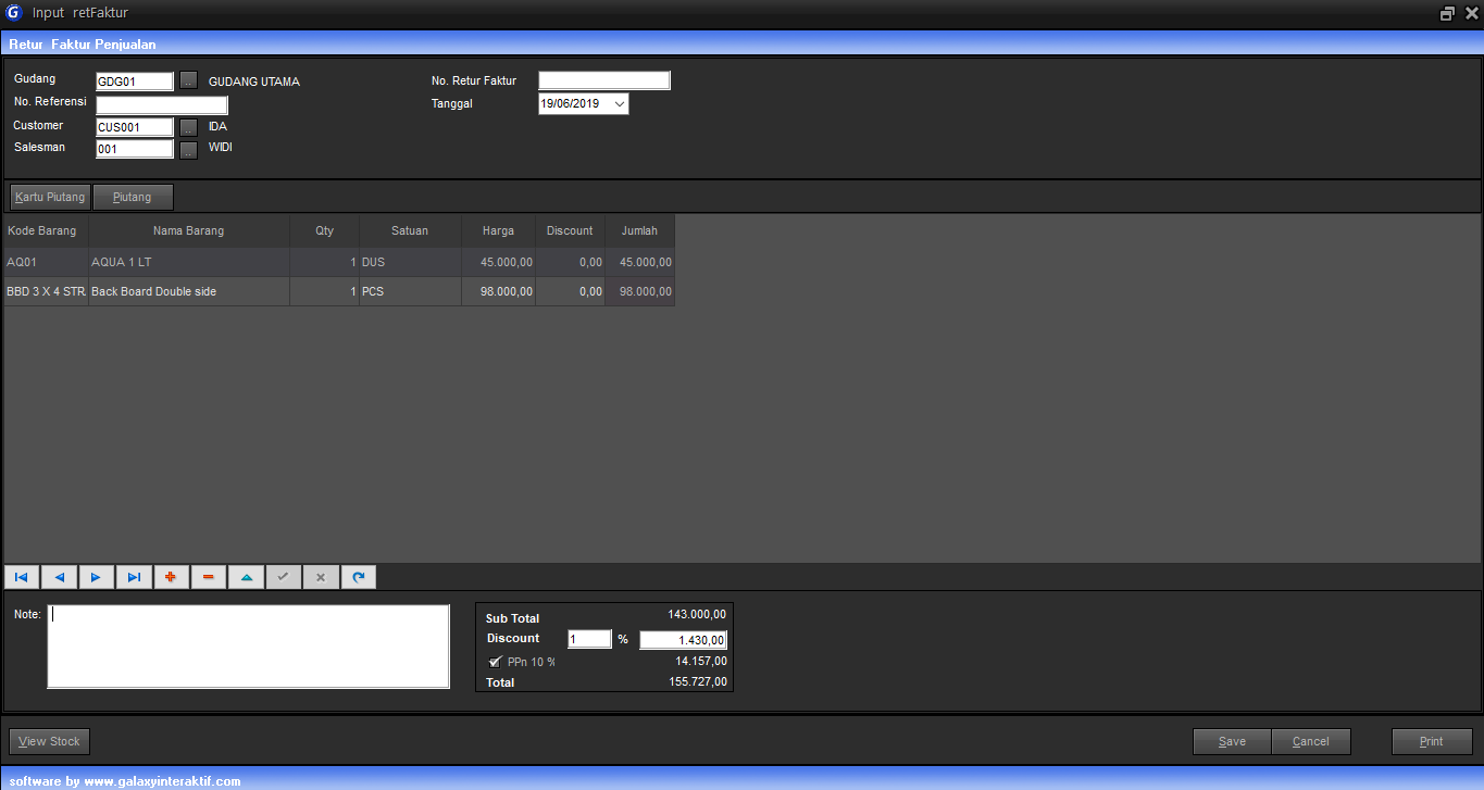 | Total | Muncul total retur yakni dari subtotal-discount+PPN10% |