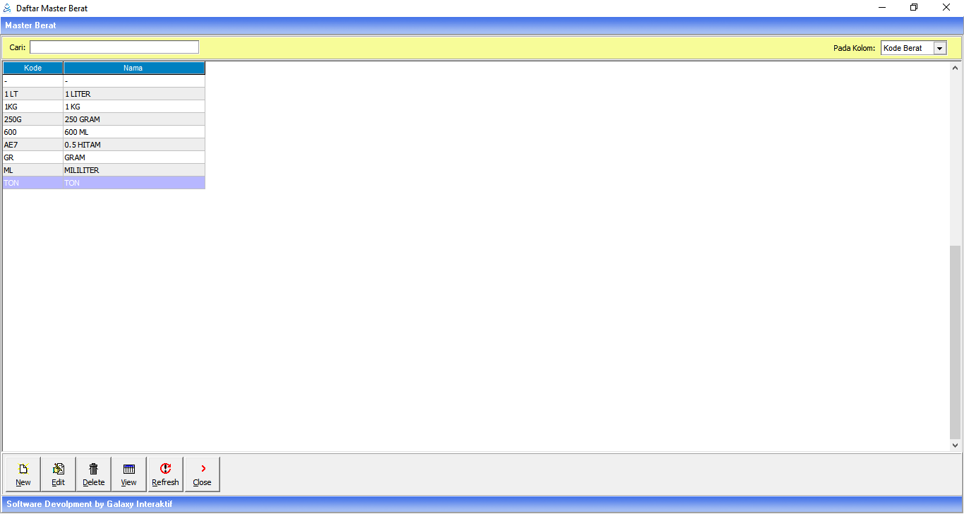 Kode | Diisi kode berat, bisa berupa huruf, angka maupun simbol max 10 karakter. |