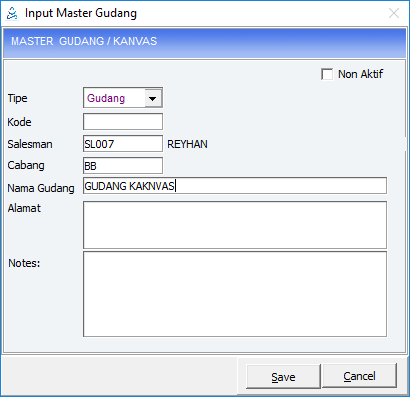 2. Master ini jangan dihapus jika sudah dipakai untuk data transaksi lain, jika gudang sudah  tidak digunakan lebih baik dinon-aktifkan saja.