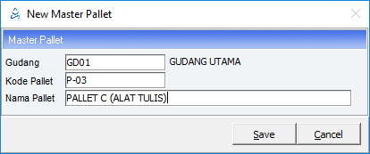 | 1 | Gudang | Klik 2x untuk mengambil kode gudang yang akan diisi pallet. Setiap penambahan gudang harus diisi pallet, meski sebenarnya gudang tsb tidak ada pallet. Jika tidak ada pallet, default diisi - |