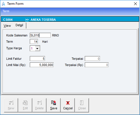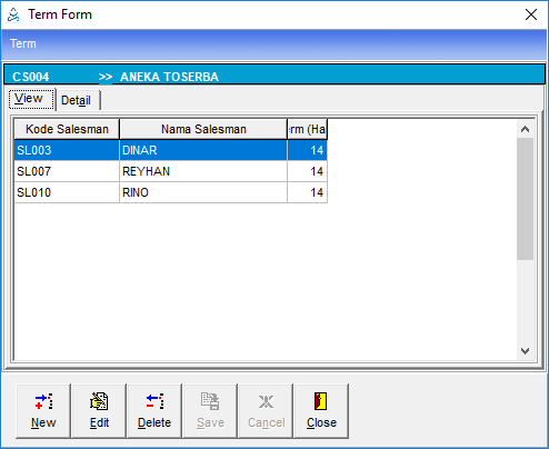 | Term | Diisi term sales, yaitu waktu jatuh tempo faktur untuk customer jika terdapat penjualan atas sales ini. |