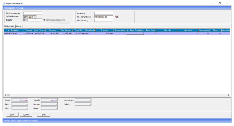 Pembayaran hutang ini dilakukan berdasarkan daftar bayar yang sudah dibuat sebelumnya ataupun tanpa mengambil daftar bayar dengan menarik langsung nomor pembelian, pembayarannya bisa dengan tunai, transfer maupun giro. Menu ini akan otomatis mengurangi hutang perusahaan kepada supplier, nah pada menu ini pula hutang akan berkurang jika mengambil nomo retur pembelian.