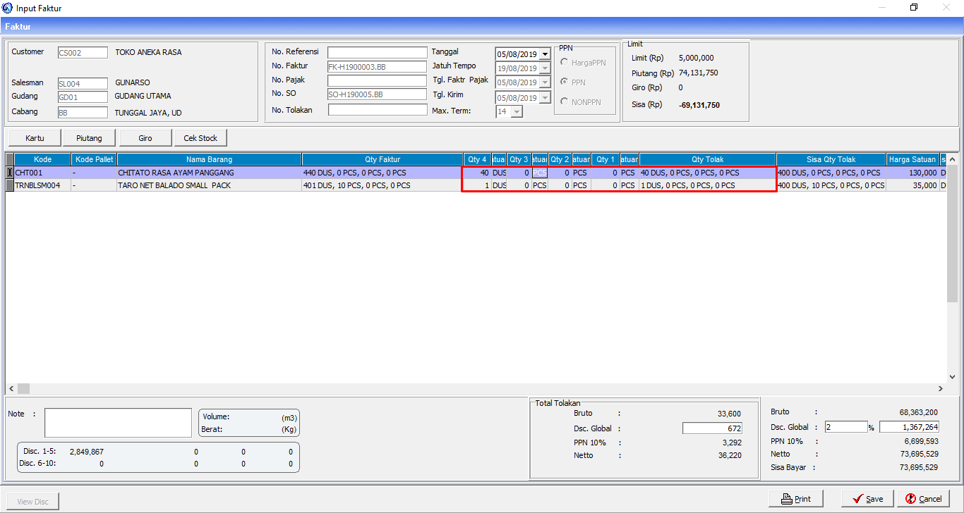 | Disc.Global | Default muncul jika faktur yang barangnya akan ditolak memiliki disc.global, namun disc.global tersebut bisa diubah. |