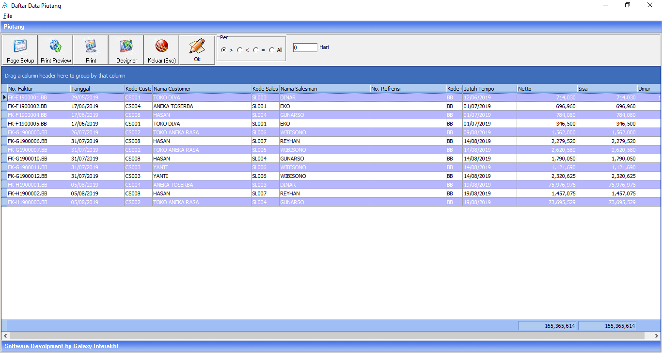 Menu Data Piutang ini di gunakan untuk melihat data-data seperti Faktur, tanggal faktur, jatuh tempo, Customer, Nama Sales, Netto, Sisa, dan umur Piutang.