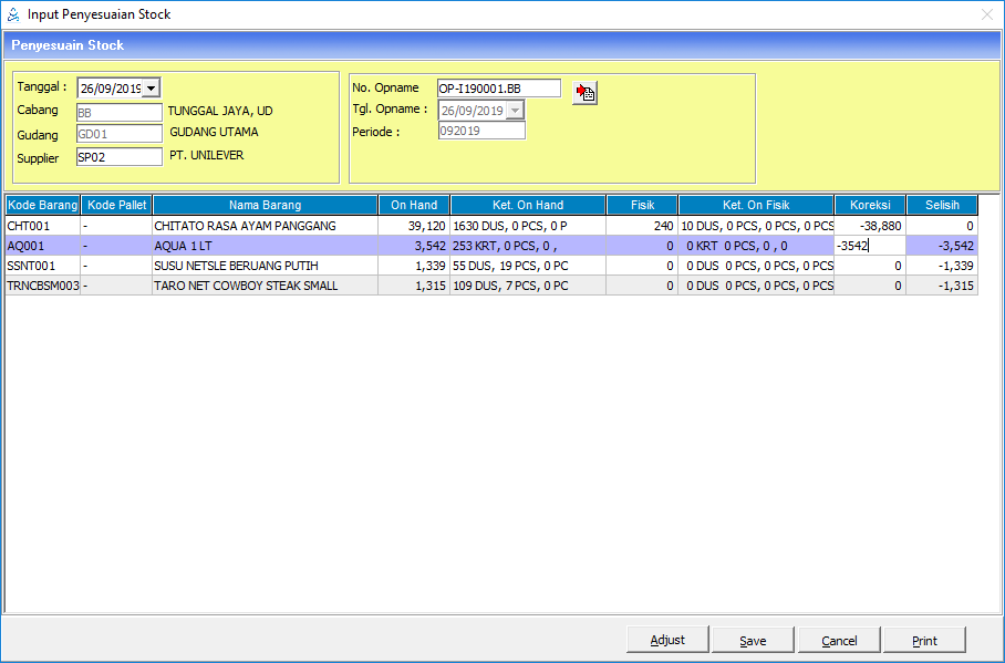 Menu ini digunakan untuk melakukan peyesuiaan antara jumlah barang yang ada di sistem (on hand) dengan barang yang ada secara fisik sesuai dengan stock opname yang telah dibuat. Jika terdapat selisih, maka lakukan koreksi dengan jumlah sesuai dengan nilai selisih tersebut.