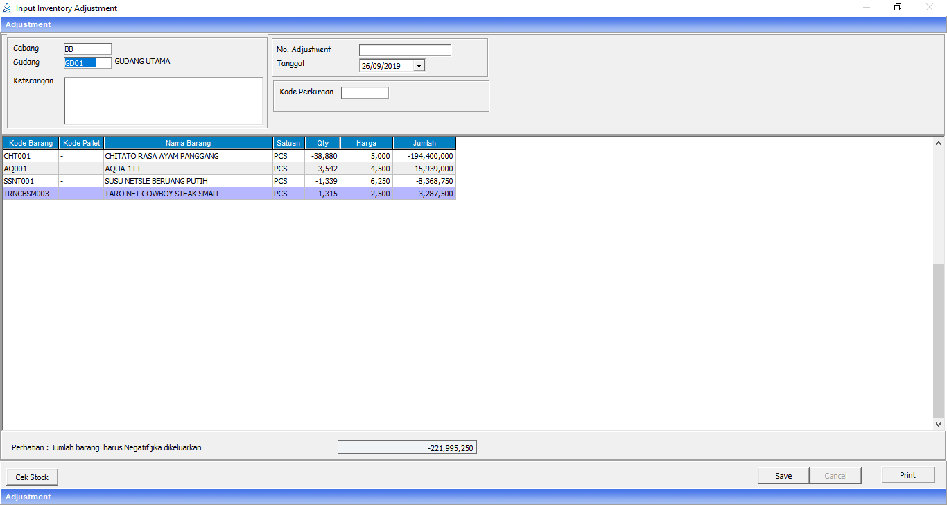 4. Lalu Klik save. Maka akan muncul jendela Master Penyesuaian Stock.