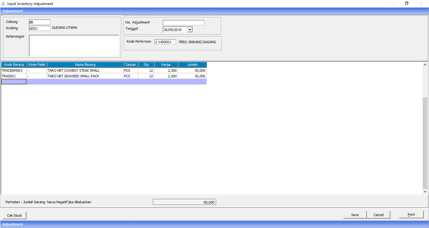 4. Lalu Klik save. Maka akan muncul jendela Master Adjusment Stok.