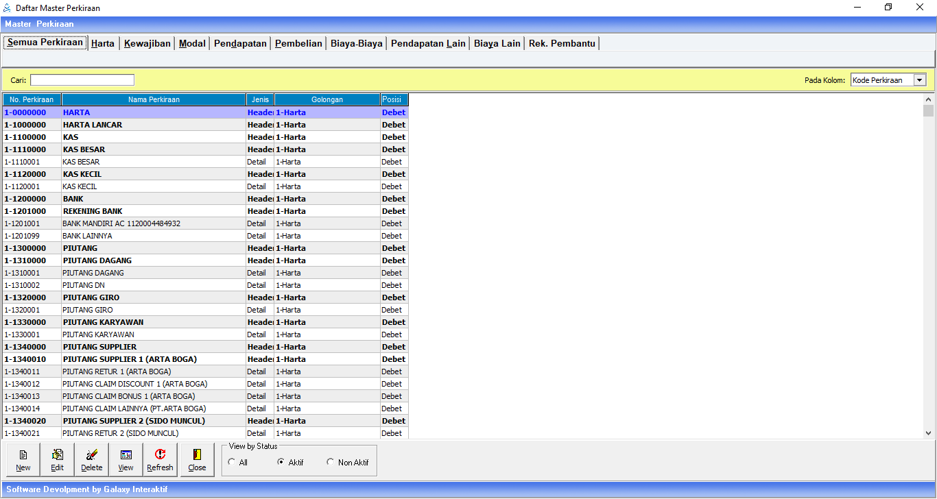 Gol.Perkiraan Pilih golongan perkiraan Harta/ Kewajiban/ Modal/ Pendapatan/ Biaya/ Pendapatan Lain/ Biaya Lain.