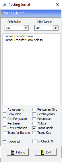 Jurnal bank di hasilkan dari transaksi Bank Masuk dan Bank Keluar yang ada di menu Kasir. Melalui menu Posting Jurnal -> Transaksi Bank. Setiap perubahan pada transaksi bank di menu kasir, maka Jurnal Bank ikut berubah.