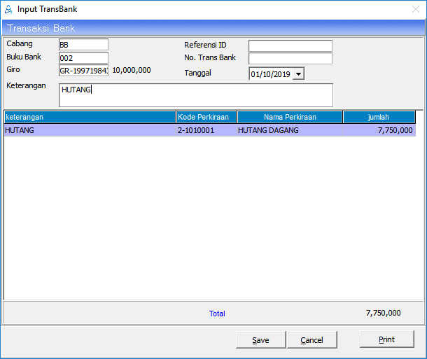| Giro | Klik 2x untuk mengambil kode giro jika data Bank Keluar tersebut menggunakan Buku Giro |