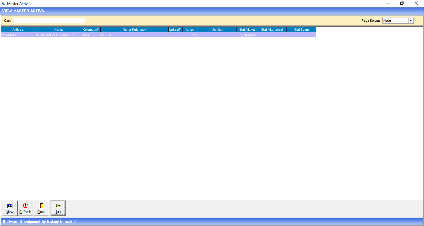 2. Sehingga tampil jendela Master Aktiva, klik tombol Jual terhadap aktiva tersebut sehingga muncul jendela konfirmasi.