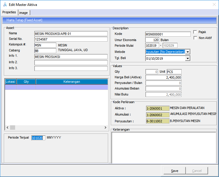 5. Muncul jendela Edit Master Aktiva, masukkan periode terjual pada kolom Periode Terjual denga format mmyyyy. Setelah selesai, klik Save  untuk menyimpan data tersebut.