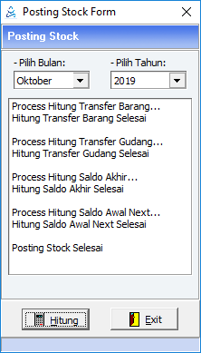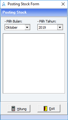 2. Tampil form posting stock, pilih periode  seperti bulan dan tahunnya yang akan diposting. Kemudian klik Hitung  untuk memulai memposting.