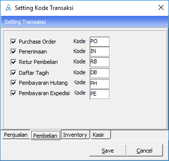 | Kode Retur Pembelian | Diisi kode untuk transaksi menu Retur Pembelian |