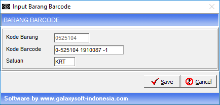 Menu ini digunakan untuk memasukkan kode barcode barang sesuai kemasan tiap barang, misalnya antara kemasan box dan pcs, kode barcode berbeda, tetapi kode barangnya sama.