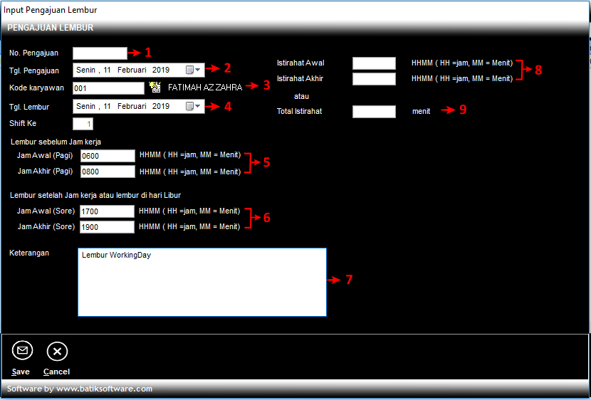 | 6 | Jam Awal Pagi/ Jam Akhir Sore | Diisi jam awal dan akhir lembur sore |