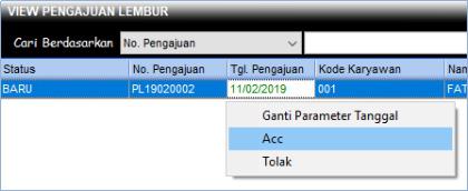 1.Buka menu Pengajuan Lembur, pilih kode pengajuan yang akan di Acc/Tolak kemudian klik kanan pilih Acc/Tolak.
