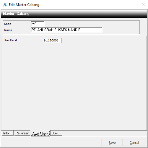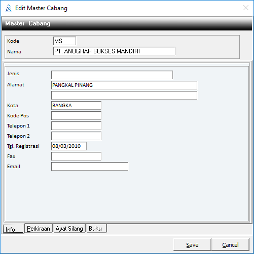 Apabila perusahaan membuka cabang baru, untuk menambahkan data cabang pada master cabang tidak dapat dilakukan secara manual karena penambahan cabang akan ada proses lebih lanjut dari PT. Galaxy Interaktif. Oleh karena itu, setiap kali perusahaan menambah cabang, segera hubungi pihak PT. Galaxy Interaktif.