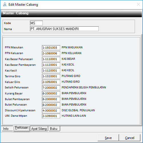 Tab ini berisi kolom-kolom untuk memasukkan kode perkiraan sebagai link account. Pada tab ini, tiap cabang bisa mempunyai link account yang berbeda dengan cabang lain. Ini bisa diatur sesuai dengan kebutuhan perusahaan. Link account tersebut harus diisi, karena berpengaruh juga terhadap data-data transaksi cabang yang dikirim ke pusat atau sebaliknya.