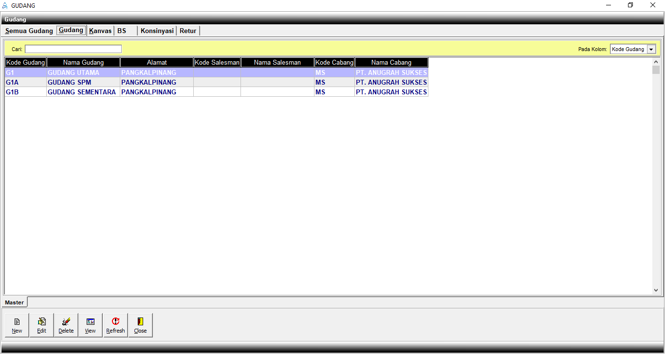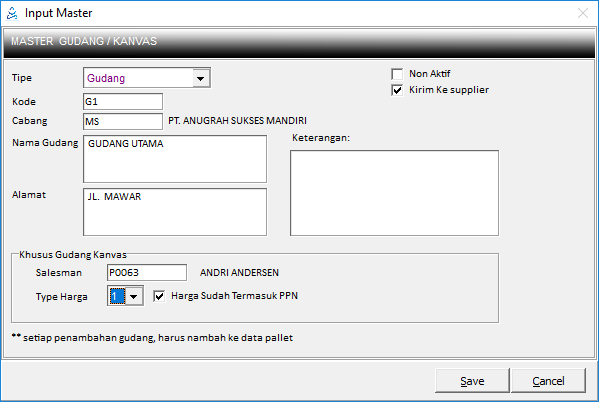 | Salesman | Klik 2x untuk mengambil kode salesman, kolom ini diisi hanya jika tipe gudangnya adalah kanvas |