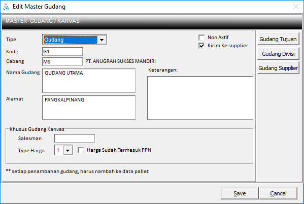 | Kirim ke Supplier | Cheklis jika data gudang bisa dikirim ke supplier, melalui program interface |