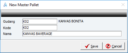 | Gudang | Klik 2x untuk mengambil kode gudang yang akan diisi pallet. Setiap penambahan gudang harus diisi pallet, meski sebenarnya gudang tsb tidak ada pallet. Jika tidak ada pallet, default diisi - |