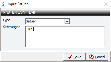 | Satuan | Digunakan untuk menginput satuan barang, data ini nantinya terkait dengan master barang. |