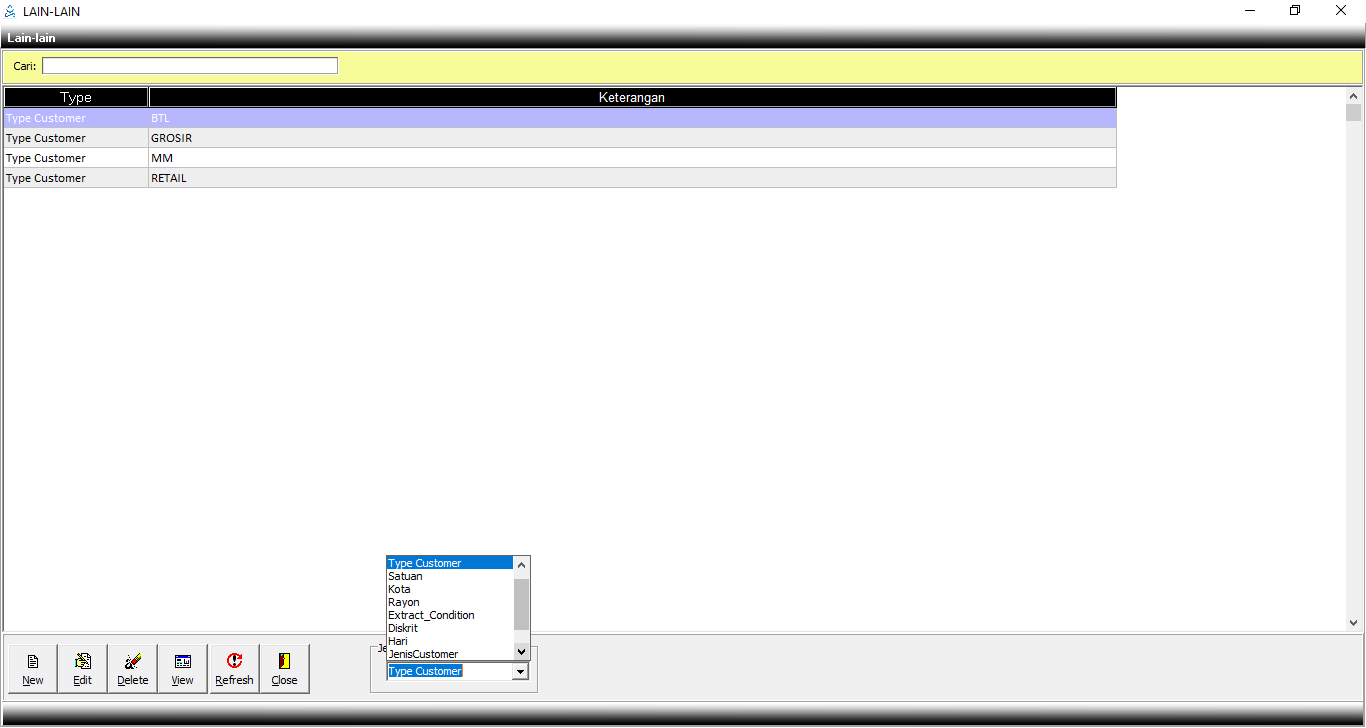| Type Customer | Digunakan untuk menampung data type customer, data ini nantinya terkait dengan master customer dan report customer. |