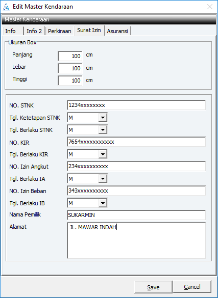 Diisi data mengenai surat-surat kendaraan dan ukuran kendaraan.