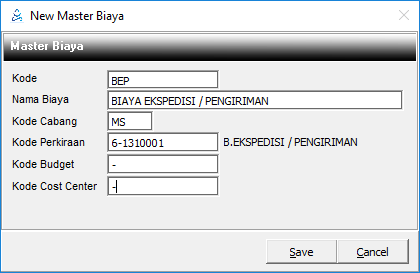 Biaya yang diinput dalam Master Biaya ini adalah biaya-biaya yang biasa dikeluarkan pada saat distributor melakukan pembayaran hutang atau pada saat customer melakukan pelunasan piutang, biaya ini juga nantinya digunakan untuk membuat nota kredit (sebagai pemotong piutang) maupun nota debet (sebagai pemotong hutang).