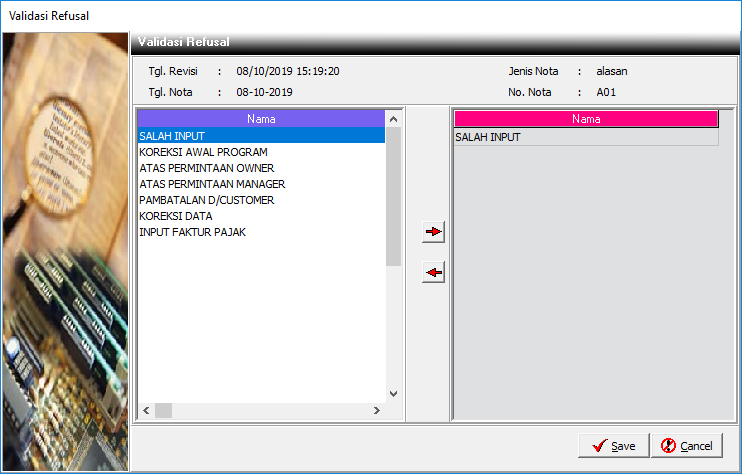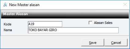 Master alasan ini berfungsi untuk menginput data alasan terkait dengan ditolak/coretnya barang atau batalnya barang yang dijual kepada customer.