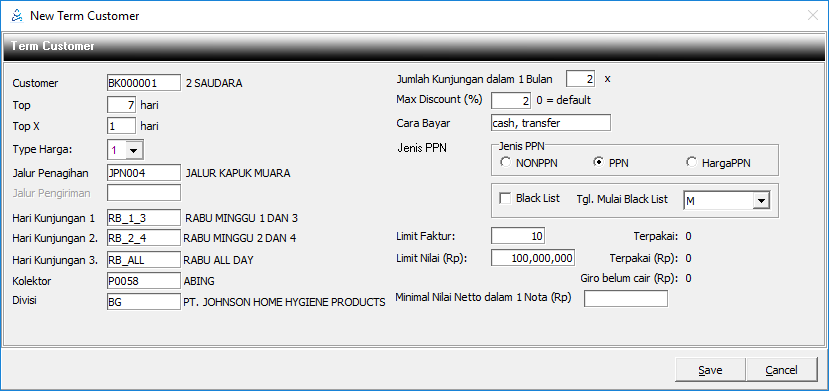 Diisi jumlah rupiah limit piutang yang diberikan ke customer. |