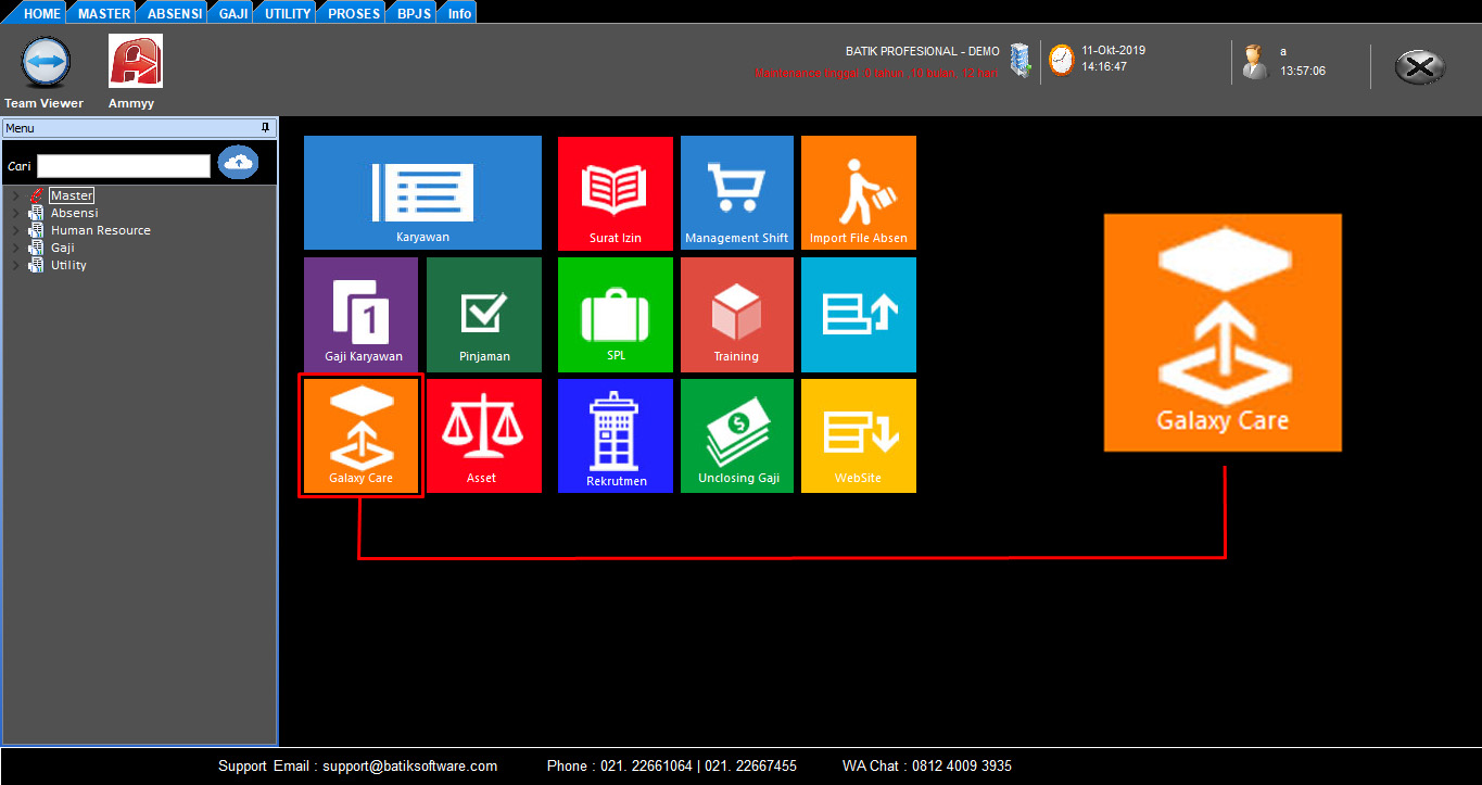 Menu galaxy care berfungsi sebagai penghubung antara Customer pengguna Program Batik Payroll Galaxy Interaktif dengan Team PT. Galaxy Interaktif, guna membantu mengatasi permasalahan dalam menjalanakan Program Batik Payroll Galaxy Interaktif agar lebih efektif dan efisien.