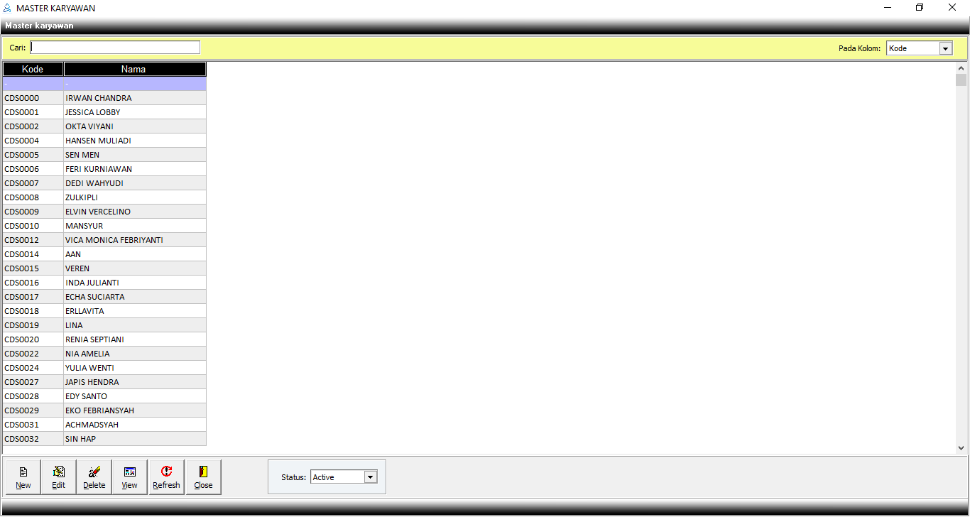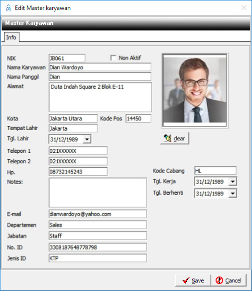 | Tgl Berhenti | Diisi tanggal karyawan mulai berhenti, apabila karyawan sudah tidak bekerja lagi sebaiknya master ini jangan dihapus. Lebih baik di non-aktifkan saja, agar data yang terkait dengan master ini tidak berantakan. |