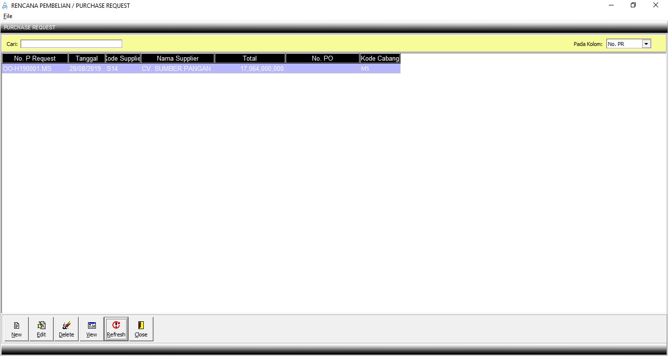 4. Lalu Klik save. Maka akan muncul jendela Master Purchase Request.