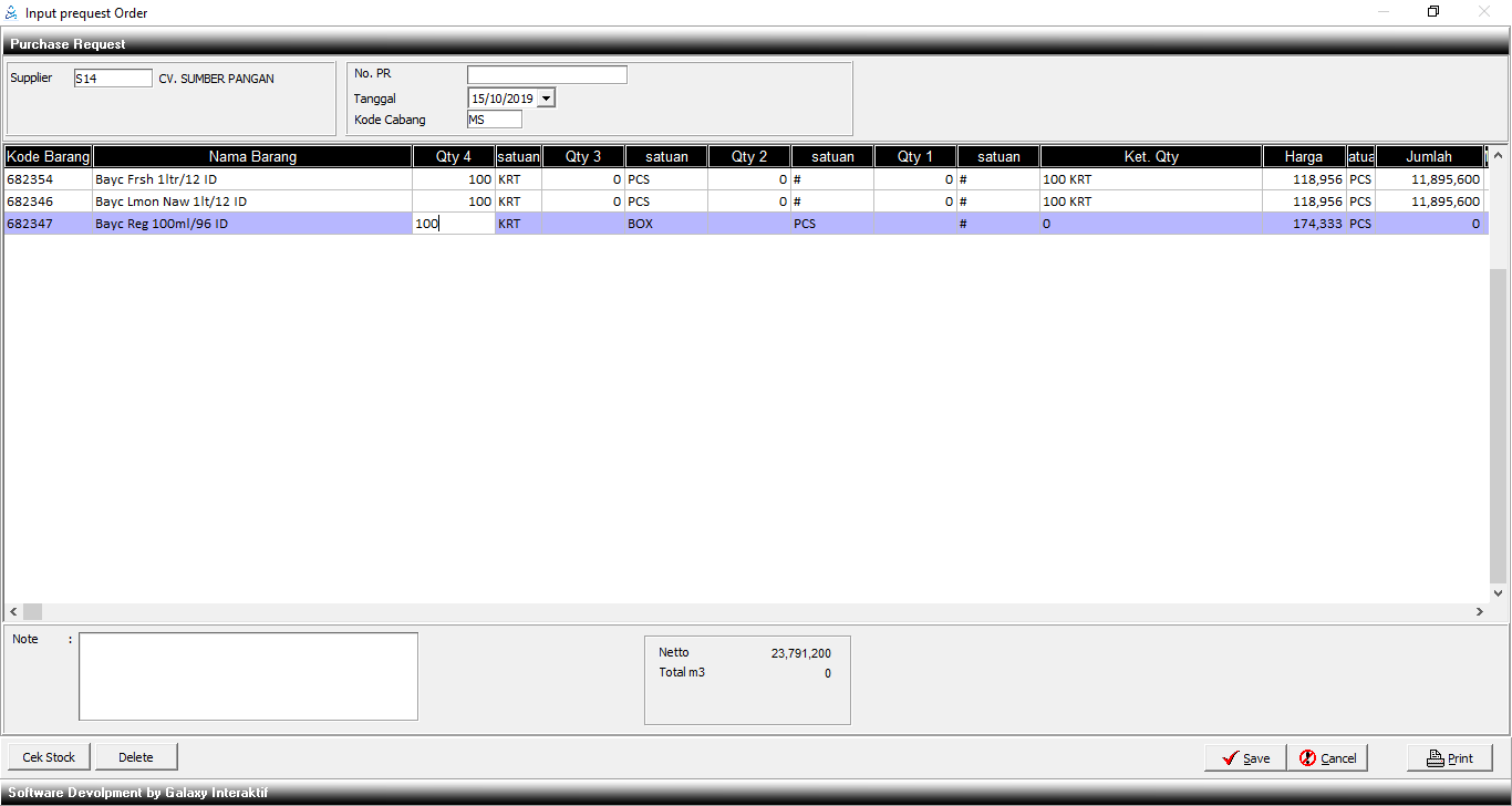Input qty barang yang akan dipesan, maka Netto dan Total M3 (volume) akan muncul. |