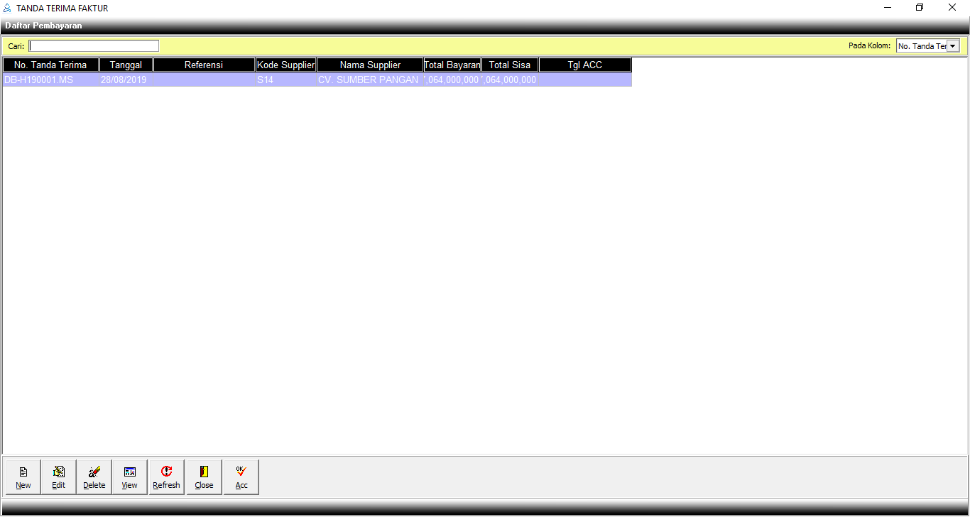 | No. Rekening | Klik 2x untuk mengambil nomor rekening supplier, namun sebelumnya nomor rekening arus didaftarkan dahulu di Master No. Rekening. |